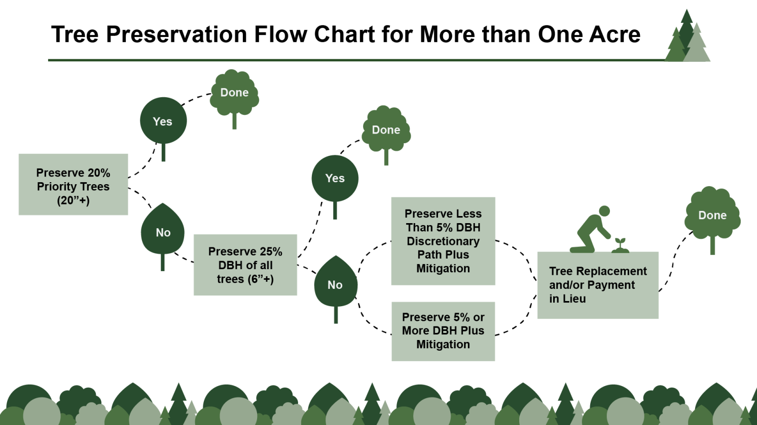 - Another option for developers is to preserve 25% of what is called the total “diameter at breast height” on a site. Diameter at breast height is the measurement of a tree’s diameter measured at 4 ½ feet off the ground. For this option, that means diameters of all trees that have a 6-inch diameter or larger on a development site would be added together, and 25% of that total would need to be preserved.