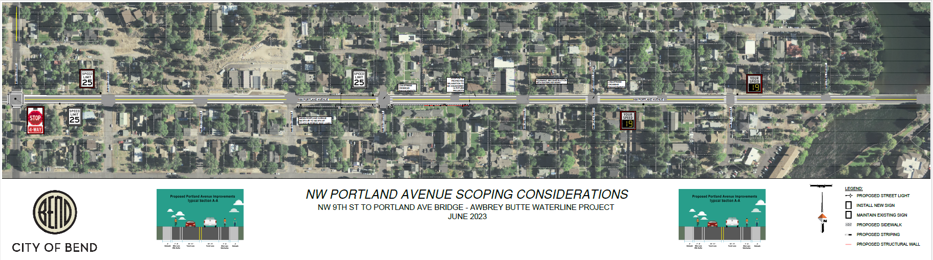 - Additional lighting, striping, and pedestrian crossing signage are planned at the intersection of Portland Avenue and Ninth Street, Fifth Street, and Awbrey Road.