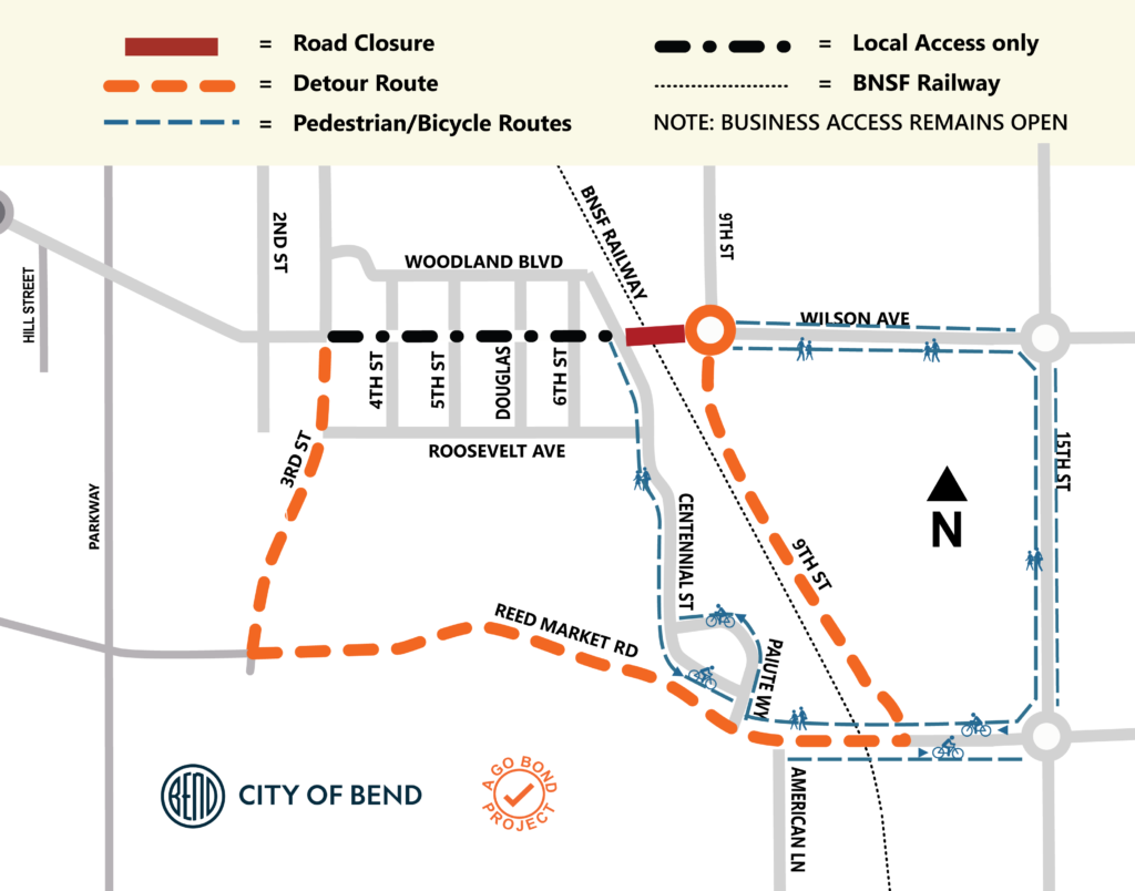 Use the interactive map above to see active detours and closures for this project and all city projects. Sign up to receive a weekly traffic report at www.bendoregon.gov/traffic.