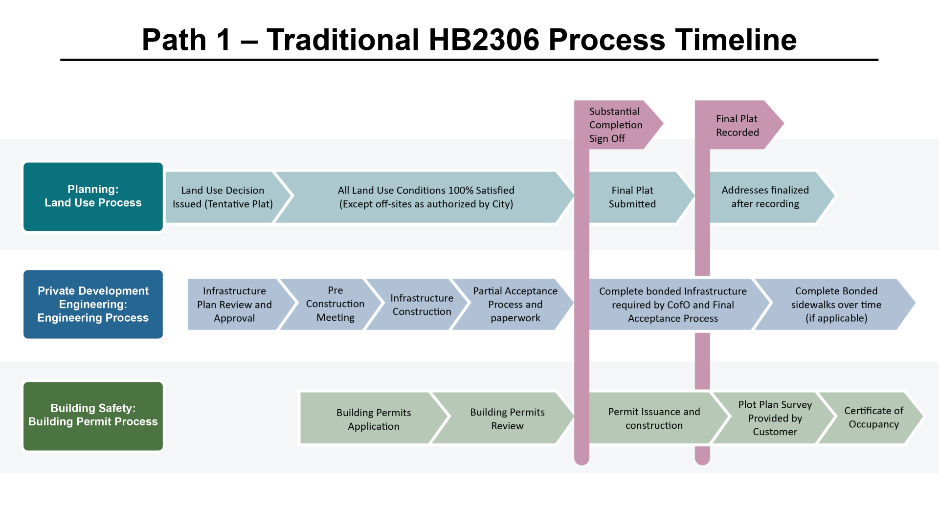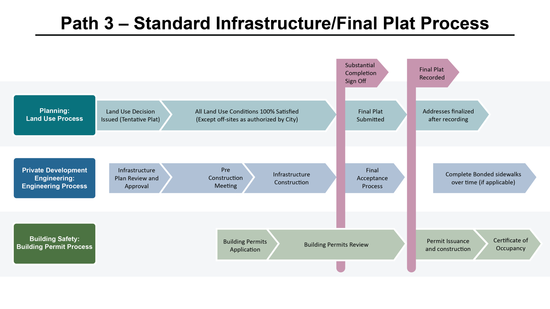 The overall goal is once the infrastructure process is completed and signed off, the Final Plat can be immediately approved and recorded. Building permits can then be issued quickly after the Final Plat is recorded. With proper project management and coordination with the City, this should help reduce the developer’s overall timeline for building permit issuance by 2-4 months compared to the current procedures.