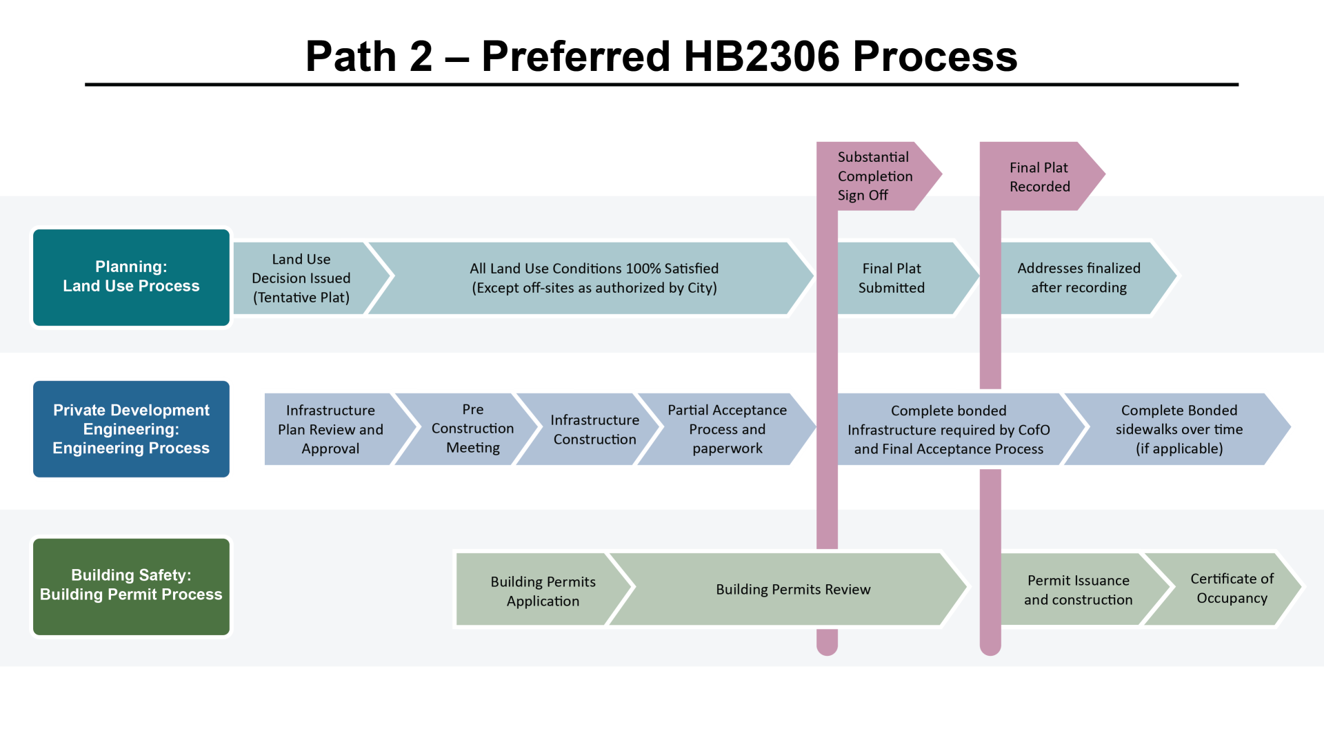 The goal of House Bill 2306 is to get housing built faster. While the bill has good intentions, it introduces some risks that might discourage early building permit applications. To address this, the Community Development Department suggests changing the current processes from subdivision application approval through infrastructure construction and final plat review. These changes aim to allow home construction in a similar timeframe to what House Bill 2306 outlines, but with less risk.