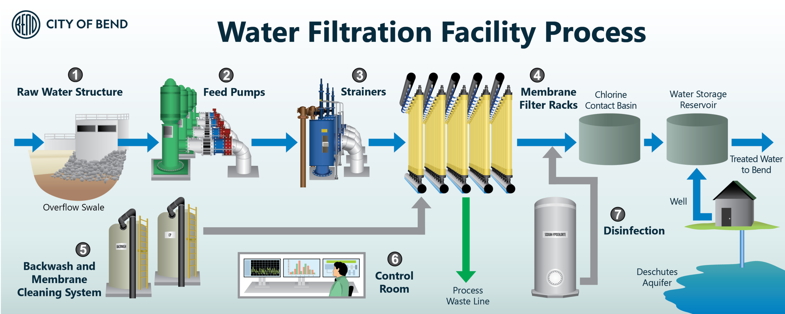 All surface water from Bend Municipal Watershed is treated, at the Water Filtration Facility by membrane filtration, which removes pathogens and other particles too small for the naked eye to see. A small amount of chlorine is added to deactivate any viruses and bacteria while keeping our network of storage tanks and pipelines clean. This image shows a snapshot of the surface water filtration process.